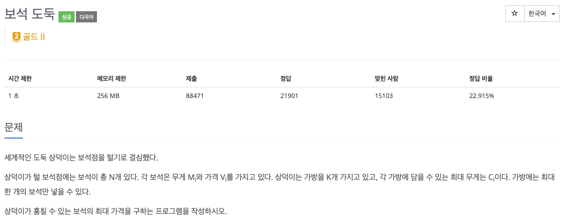 문제의 핵심은 무게 제한이 있는 가방에 최대 가치를 가지는 보석을 훔치는 방법이다.