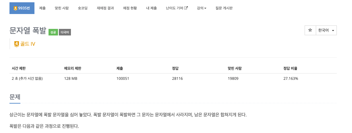 - 제거 후 남은 문자열에서 다시 폭발 문자열이 등장할 수 있다면 또 제거한다.