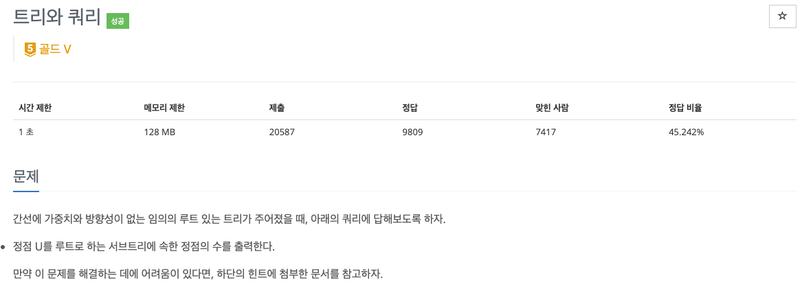 • 각 쿼리는 정점 U를 루트로 하는 서브트리의 정점 개수를 묻는다