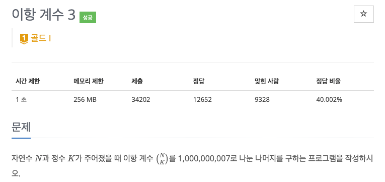 이 문제는 조금 어렵다. 모듈로 연산(1000000007)이 포함된 큰 수의 이항계수를 다루기 때문에, 단순한 팩토리얼 연산으로는 시간 초과가 일어난다.