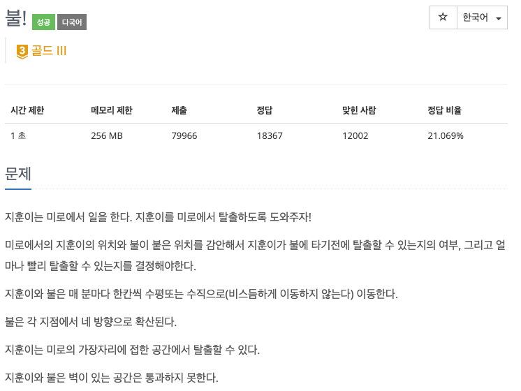 • 이동하려는 칸이 불이 이미 도착했거나 동시에 도착하면 안 됨