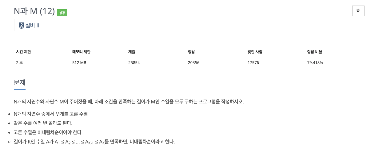 백트래킹 함수는 depth가 M이 되면 수열을 완성하고, start부터 시작하는 이유는 비내림차순 조건 때문이다.