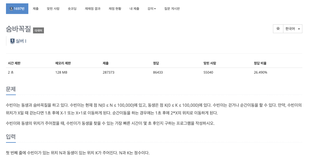 목표는 수빈이가 동생에게 도달하는 데 걸리는 최소 시간을 구하는 것이다.