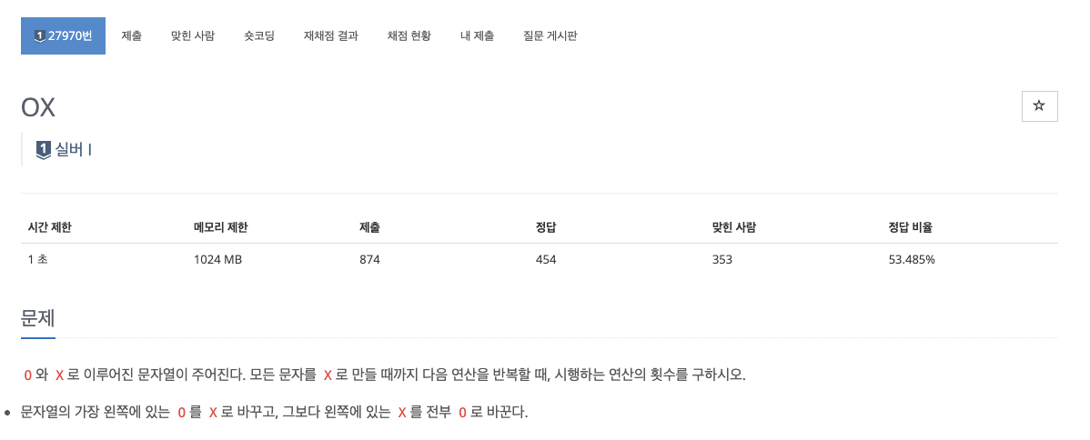 - 문자열 S가 주어집니다. S는 'O'와 'X'로만 구성되어 있다.