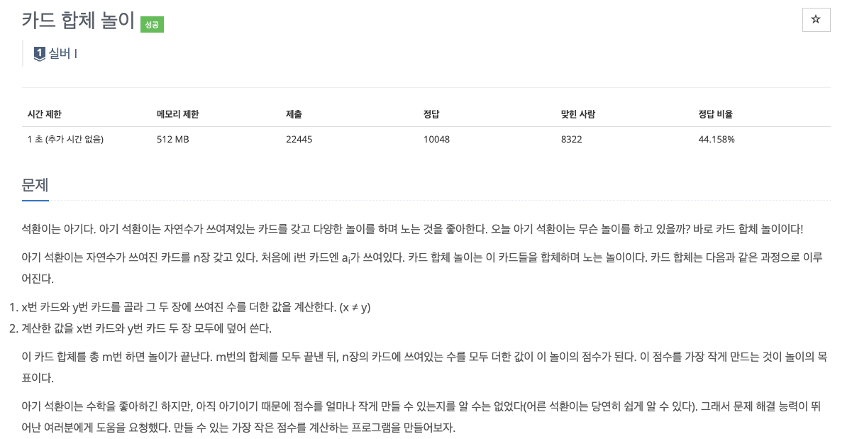 - M번에 걸쳐 가장 작은 두 장을 골라 합친 뒤, 그 값을 두 장 모두에 덮어 씌움