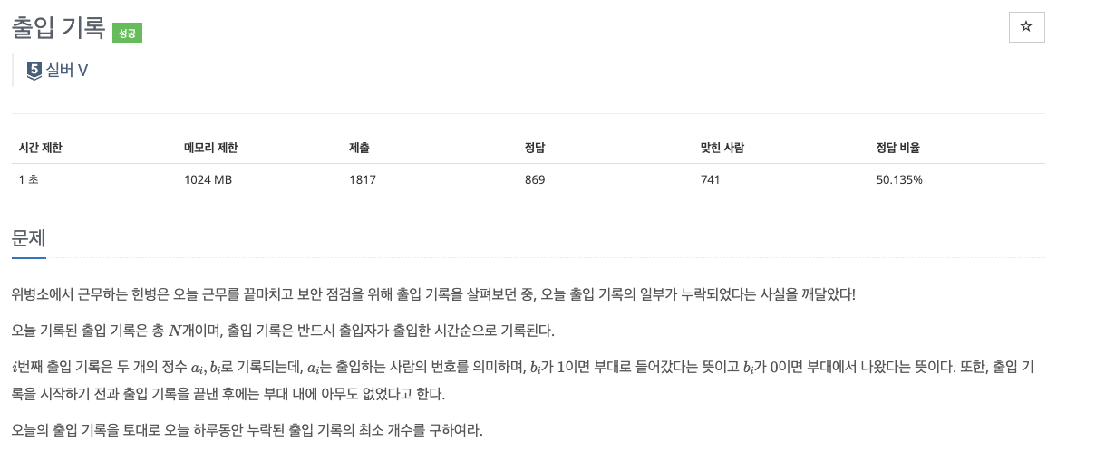- 입력: 사람 번호 a, 출입 여부 b (1 = 입장, 0 = 퇴장)