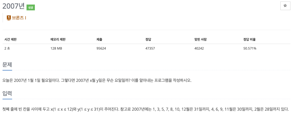 [브론즈 1] 백준 1924 - 2007년 (파이썬)