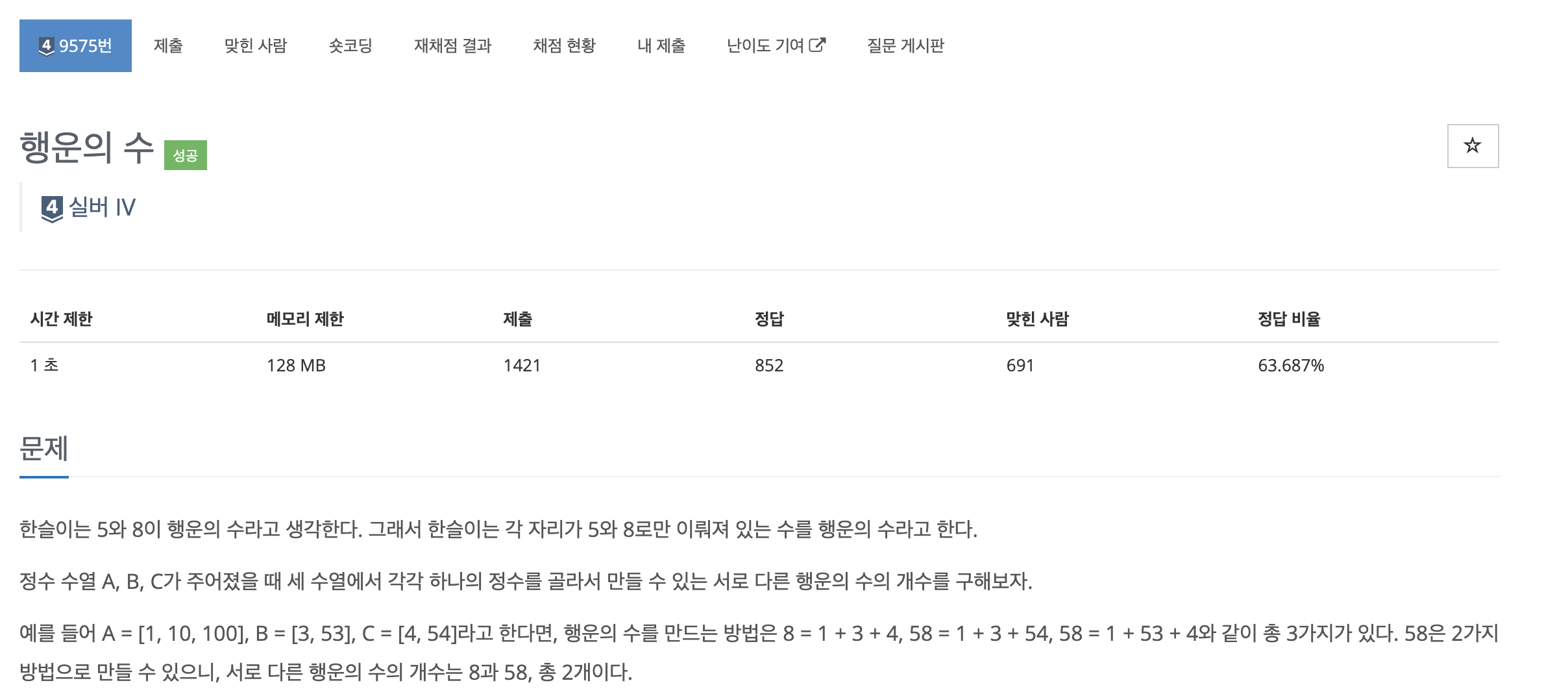 [실버 4] 백준 9575 - 행운의 수 (파이썬)