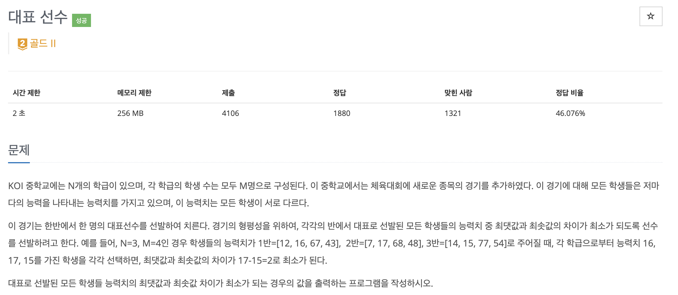 - 즉, N명의 대표를 뽑을 때 최소 실력차가 가장 작은 집합을 만들고, 그 차이를 출력해야 함.