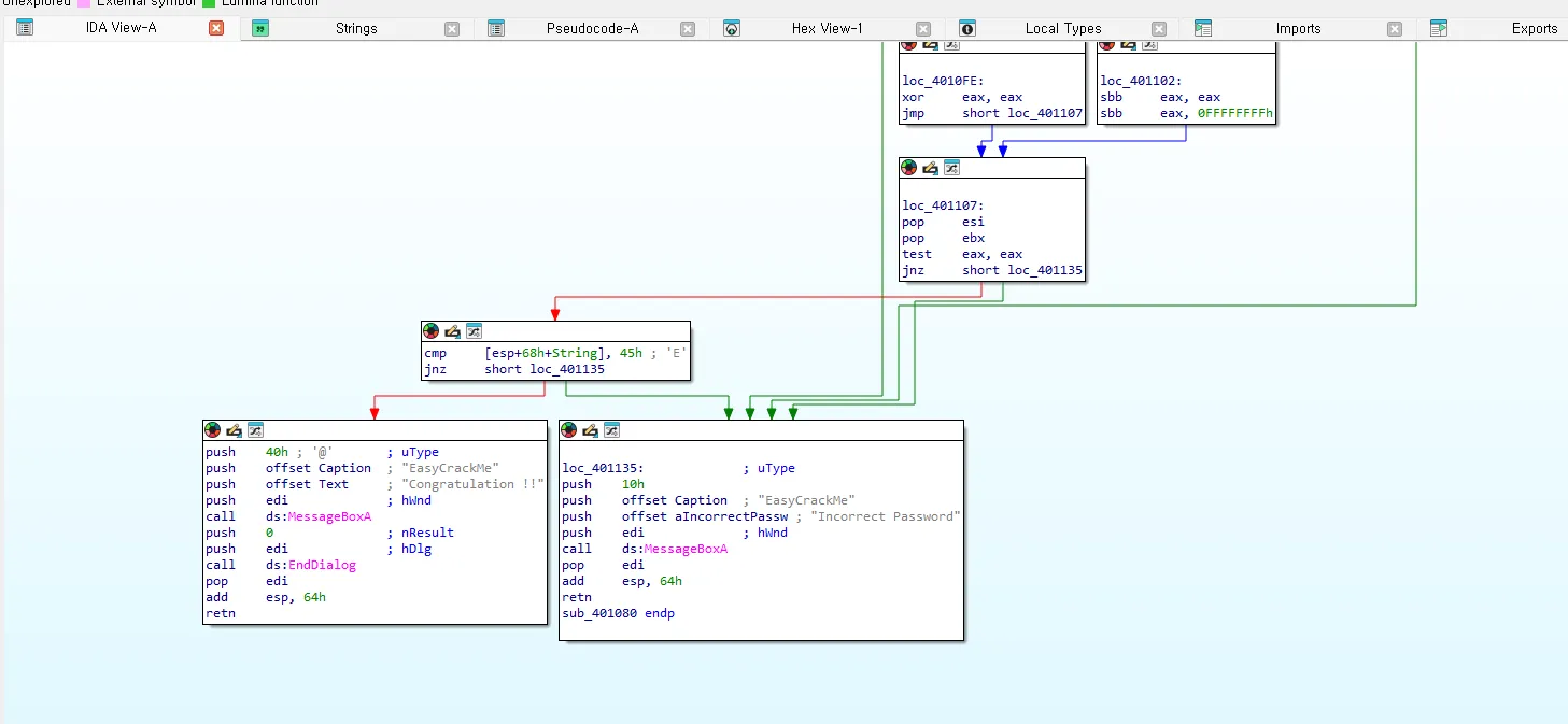 이건 간단히 말하면 스택에 있는 String이라는 버퍼의 첫 번째 바이트가 ‘E’ 인지 검사하고, 그렇지 않으면 loc_401135로 점프하는 조건문이다.