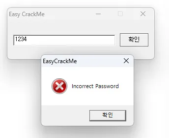 Easy_CrackMe.exe 를 실행하면 다음과 같은 창이 나타난다.
