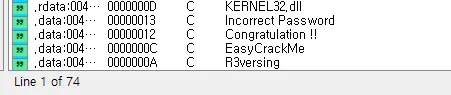 Strings에서는 74개의 문자열들이 발견 되었으며, Incorrect Password 및 Congratulaion !! 등의 문자열 패턴을 확인 할 수 있다.