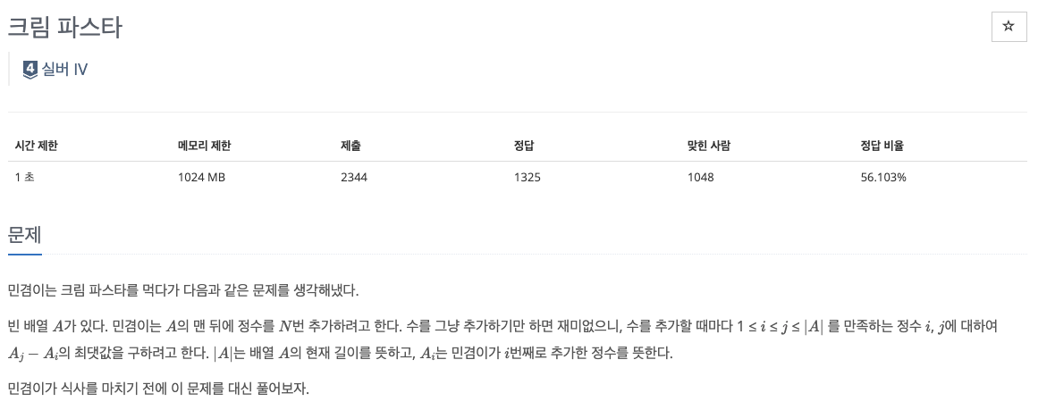 [실버 4] 백준 25214 - 크림 파스타 (파이썬)