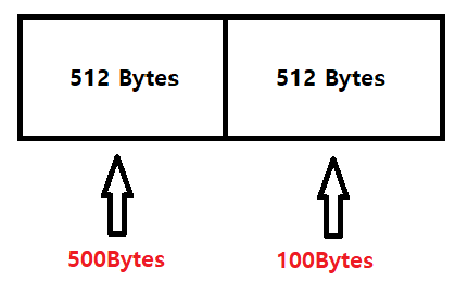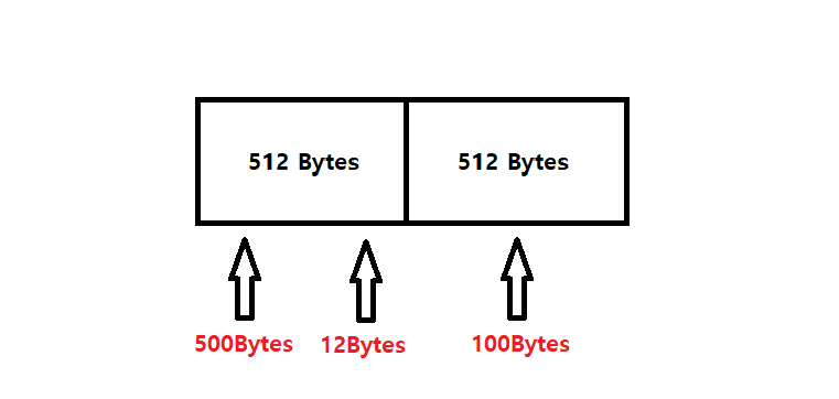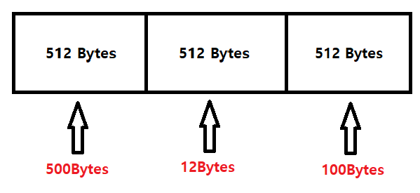 이렇게 500, 12, 100이 들어왔다면 512Bytes에 2개의 파일을 저장할수 있는것이 아닌 아래 그림과 같이 하나의 클러스터에는 한개의 파일만 저장 할 수 있는 것이다.