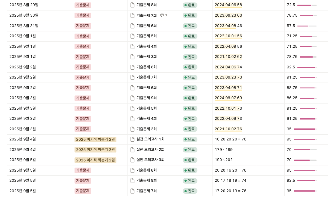 나는 노션에 정리하면서 푸는 방식으로 진행했으며, 기출문제를 거의 3회독 하고 갔다. 3회독 하면서 어디 과목이 문제인디 점수가 어떻게 되는지 확인하면서 진행했고, 대부분의 기사시험이나 자격증은 기출문제 3회독은 하고 가자는 마인드를 가지고 있다.