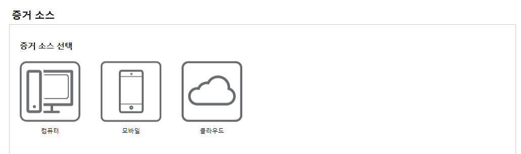 증거 소스를 선택해 줘야 합니다. 증거 소스로는 컴퓨터, 모바일, 클라우드가 있습니다.