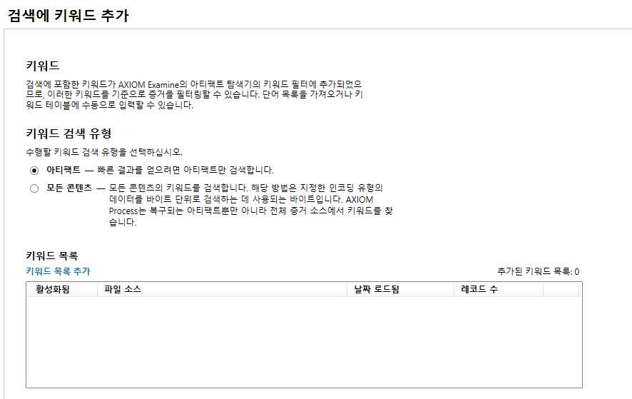 검색에 키워드 추가 기능은 말 그대로 증거 내에서 특정 키워드를 추출하는 것입니다.