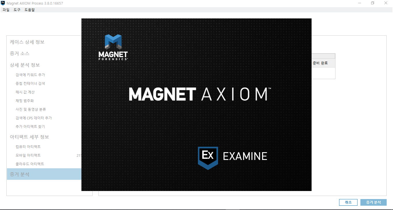 이미지 해시 계산이 완료되니 MAGNET Axiom Examine으로 자동으로 넘어가졌습니다.