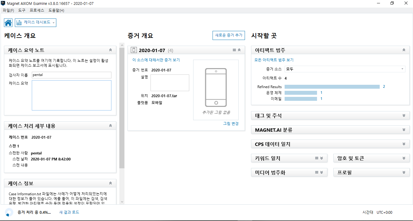 증거 처리가 되고 있는 상황을 확인할 수 있습니다. 케이스 대시보드에는 케이스 개요, 증거 개요 등이 있습니다.