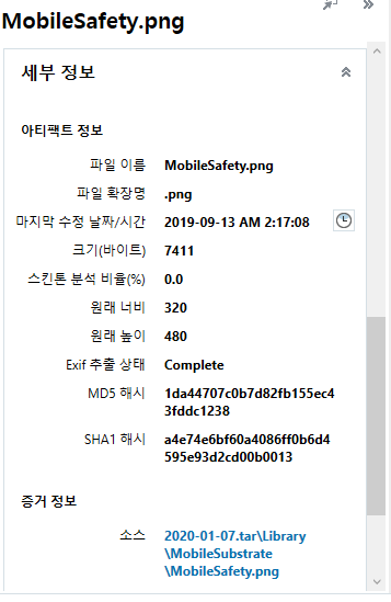파일 이름, 확장자, 마지막 수정 날짜, 크기, MD5, SHA1 을 알려주고 있습니다.