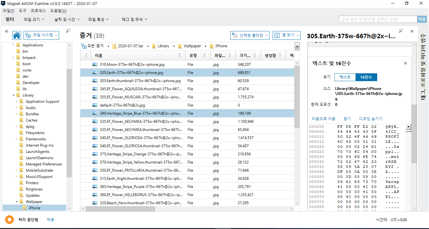 증거 파일의 위치를 눌러봤더니, 증거 파일의 위치로 옮겨졌으며, Hex값을 확인할 수도 있습니다.