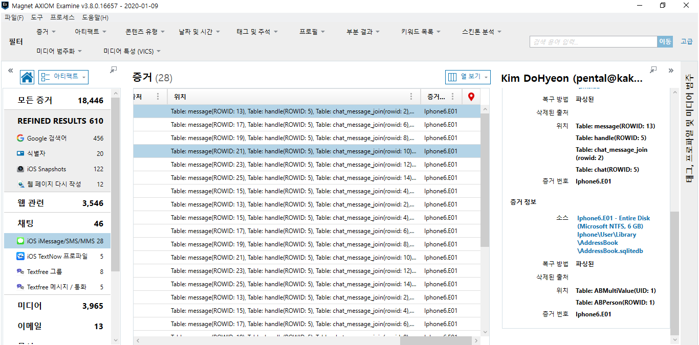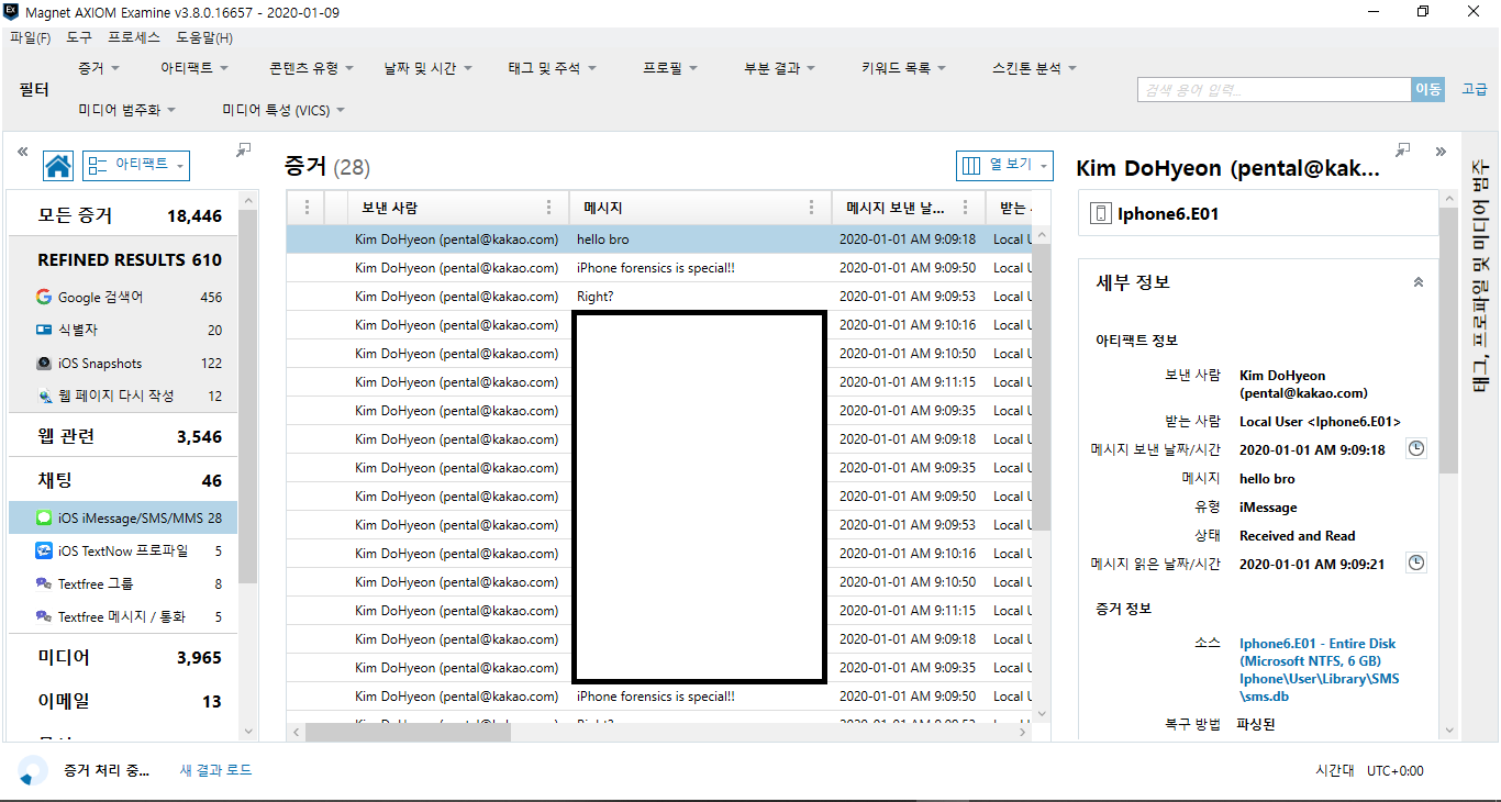 필자의 2020-01-01 AM 9:09:18초에 보내진 메시지를 Magnet AXIOM에서는 파싱을 해서 증거로 나타내 주었습니다.