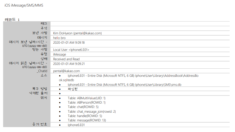 필자의 2020-01-01 AM 9:09:18초에 보내진 메시지를 Magnet AXIOM에서는 파싱을 해서 증거로 나타내 주었습니다.