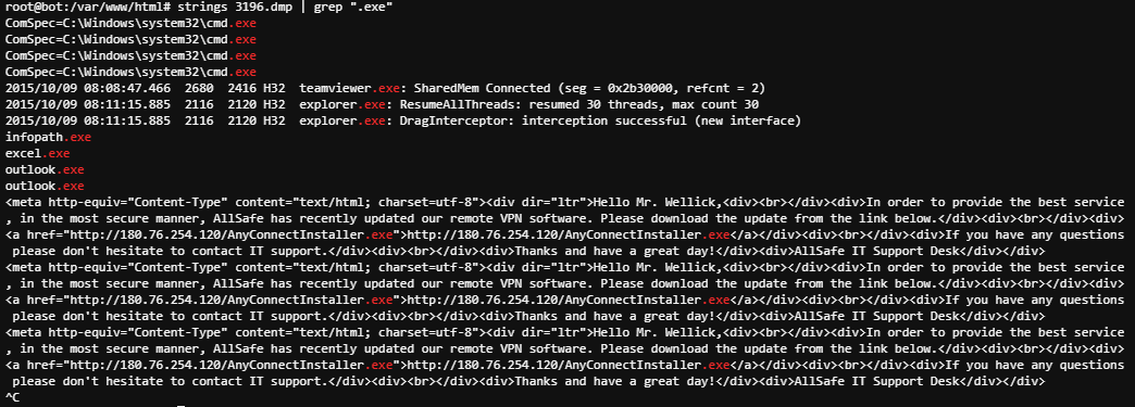 프로세스 중에서 OUTLOOK.EXE 프로세스를 덤프한다. 메모리 덤프가 가능한데 Memory Dump 파일에서 이메일을 추출하면된다. grep 기능을 통해서 @naver.com / @daum.net / @hanmail.net / @gmail.com 을 검색한..