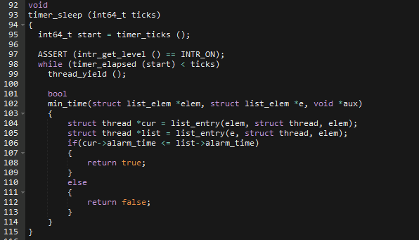 Pintos를 처음 설치하게 되면 현재 스레드가 devices/timer.c의 timer_sleep() 함수를 호출하면 지정 Tick동안 While문이 계속해서 thread_yield()를 호출하면서 CPU를 점유하지 않는 모습을 보여준다.