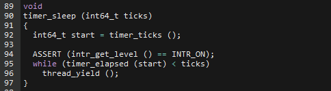 Pintos를 처음 설치하게 되면 현재 스레드가 devices/timer.c의 timer_sleep() 함수를 호출하면 지정 Tick동안 While문이 계속해서 thread_yield()를 호출하면서 CPU를 점유하지 않는 모습을 보여준다.
