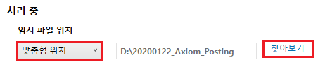 2. 처리 중 > 일시적인 파일 위치 섹션의 드롭다운 목록에서 맞춤형 위치를 클릭
