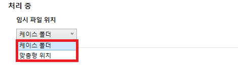 2. 처리 중 > 일시적인 파일 위치 섹션의 드롭다운 목록에서 맞춤형 위치를 클릭