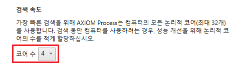 2. 처리 중 > 검색 속도 섹션의 드롭다운 목록에서 AXIOM Process가 사용하길 원하는 코어 수를 클릭