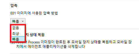 2. 이미징 > 압축 섹션의 드롭다운 목록에서 압축 방법을 선택
