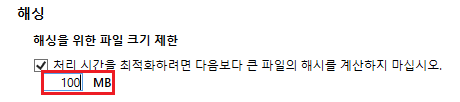 2. 해싱 > 해싱 파일 크기 제한 섹션의 처리 시간 최적화, 파일보다 큰 파일의 해시 계산 안 함 확인란을 선택