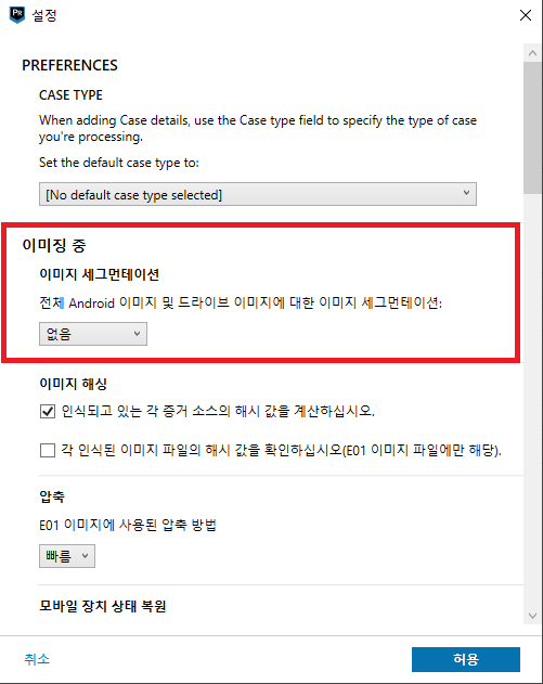 또한 이미지 압축 여부, 해시 값 작성 여부 등과 같은 검사 실행 방법을 설정할 수 있다.