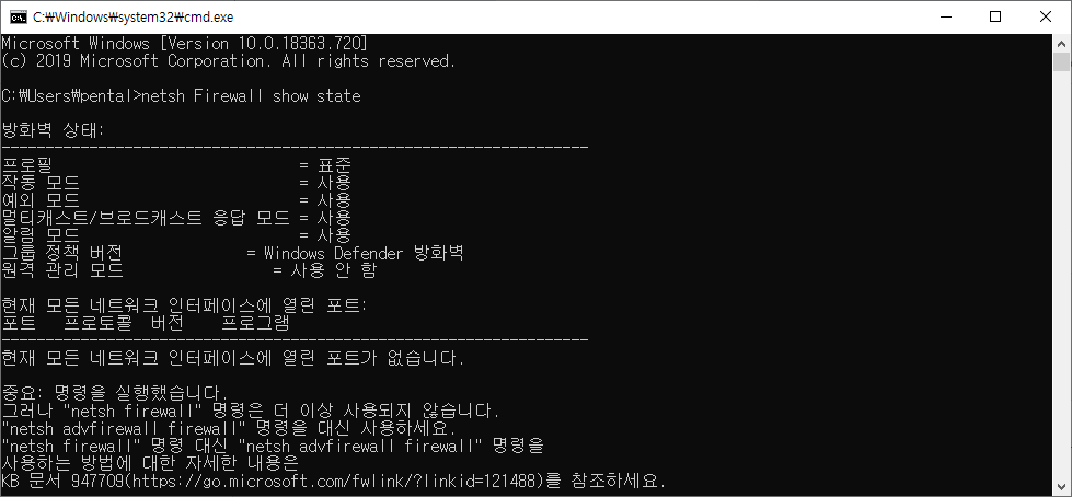 CMD에서 볼수 있듯이 방화벽의 프로필, 작동모드 예외 모드 멀티캐스트 / 브로드캐스트 응답모드, 알림 모드, 그룹 정책 버전, 원격 관리 모드 등에 관한 정보를 얻을 수 있습니다.