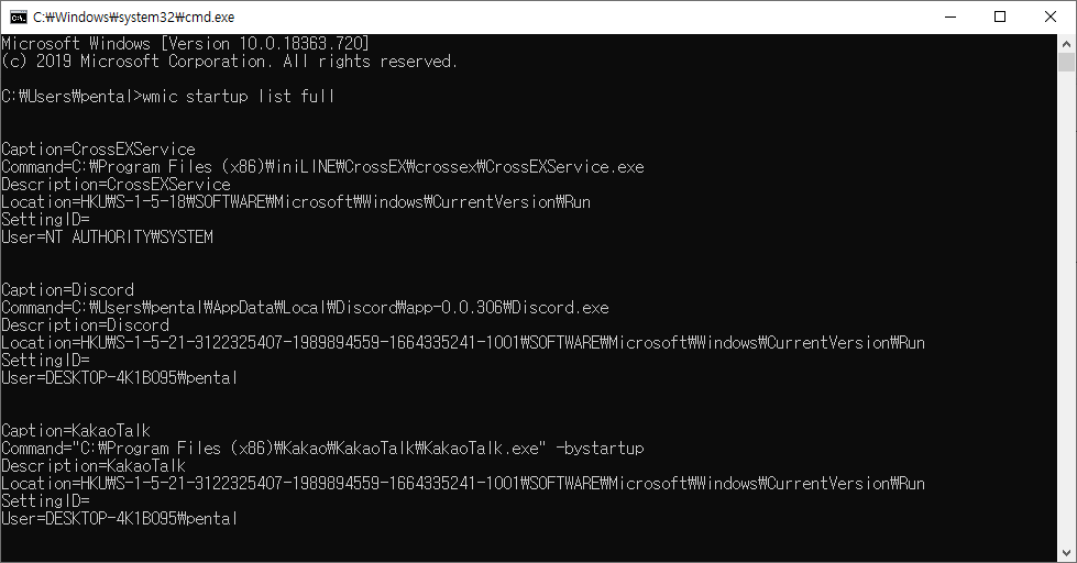 cmd 에서 위 두 명령어를 사용하면 자동시작 프로그램이 어떤게 등록되어 있는지 확인할 수 있다.