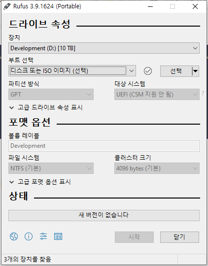 실행이 되었다면 장치 탭에서 8기가 이상의 USB를 선택해주고 선택 버튼을 눌러서 다운받은 iso를 선택해줍니다.