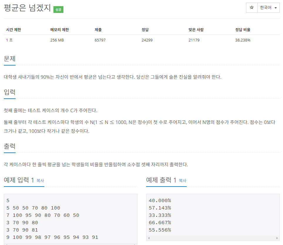 [백준] 4344 - 평균은 넘겠지 (파이썬) (C)