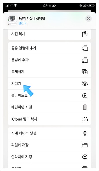 가리기 기능은 갤러리에서 사진을 선택후 옵션 버튼을 통해서 가리기를 사용할 수 있습니다.