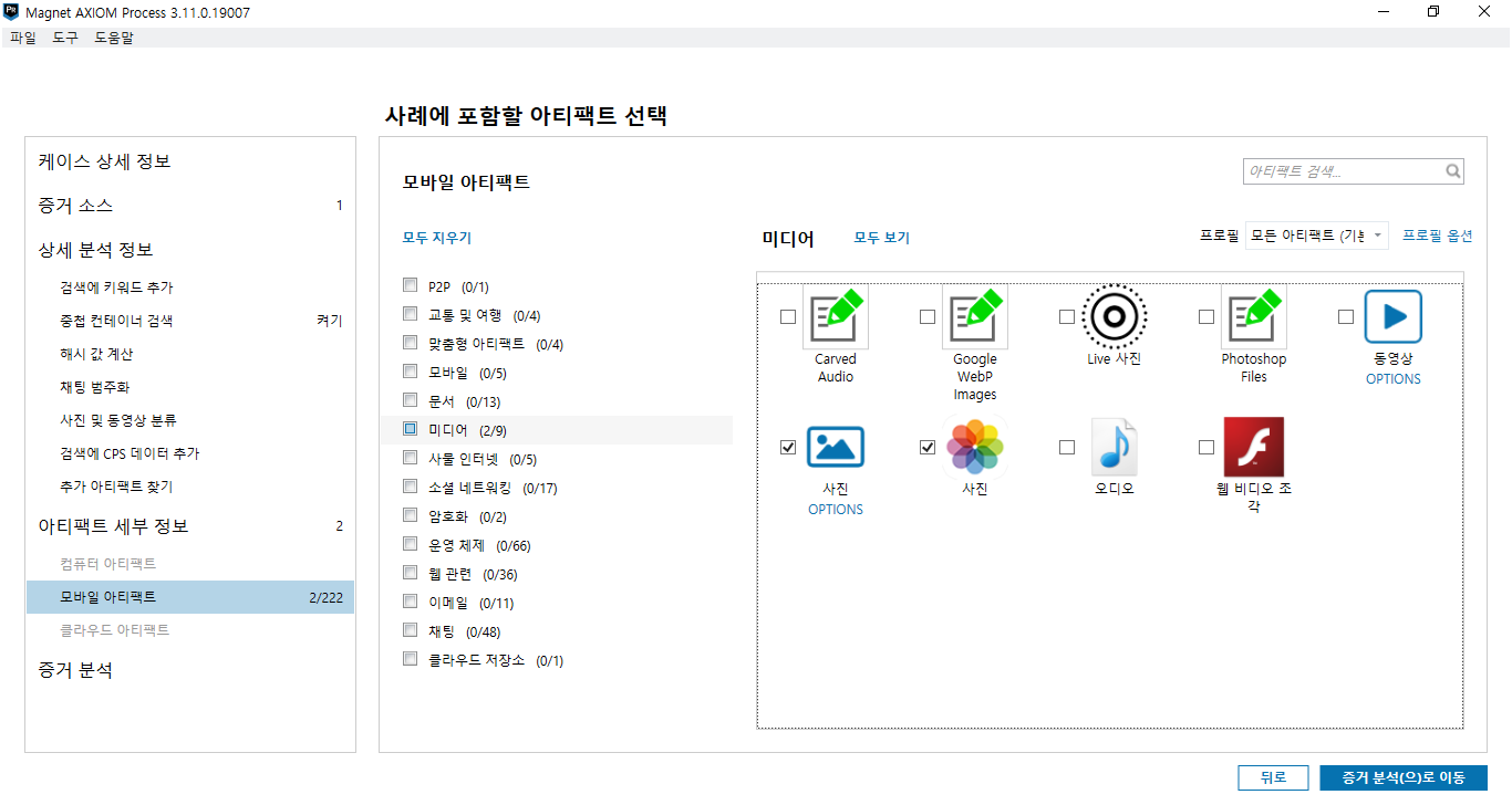 아티팩트 세부정보 - 모바일 아티팩트 를 들어가 아티팩트 미디어에서 사진 항목만 선택해줍니다. 그후 증거 분석을 시작해 줍니다.
