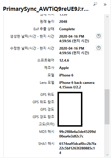 위 사진과 같이 모델명, Lens 모델, MD5해시, SHA1해시, GPS좌표 등등의 상세 정보를 파악할 수 있었습니다.