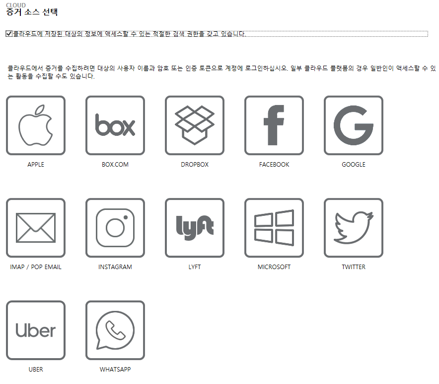 AXIOM Process의 클라우드 증거 소스를 선택할 때 대상의 로그인 정보를 사용하여 다양한 클라우드 기반 플랫폼에서 증거를 얻을 수 있습니다.