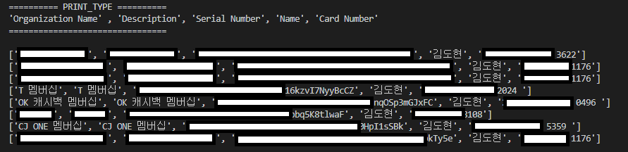 대강 소스를 이렇게 짜주게 되면, 조직과 조직 설명, 일렬번호, 카드 소유자 이름, 카드 번호를 파싱해 옵니다.
