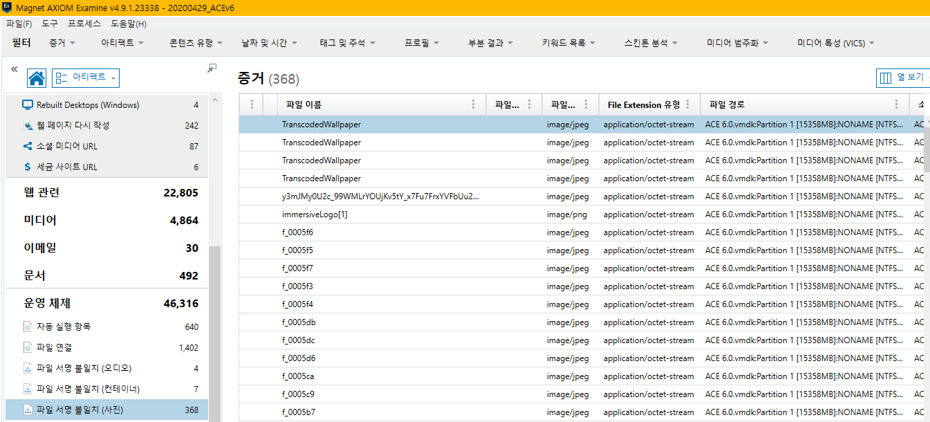 한가지 아쉬운 점은 Magnet Axiom 도구에서 파일 서명 불일치 탭에서 확인 할수 없다는 점이었습니다.
