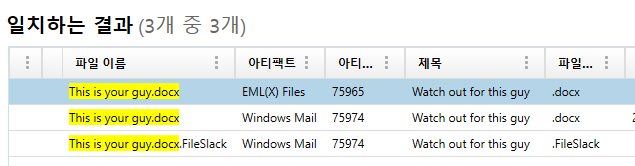 This is yout guy.docx가 첨부된 이메일 중 이메일의 제목은 Watch out for this guy 임을 확인 할 수 있었습니다.