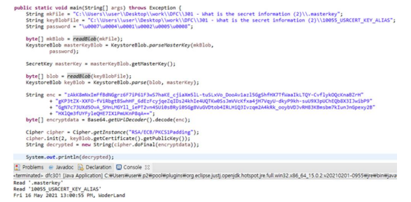 [그림-18]의 secret_preference.xml 값을 복호화 해야 될 문자열로 설정한 뒤 [그림-9]의 패턴 값으 로 keystore 데이터인 “.masterkey”, “10055_USRCERT_KEY_ALIAS”(공개키)를 복호화 후 구해진 RSA 키로 입력했던 secret 문자열을 복호화 할 수 있다.