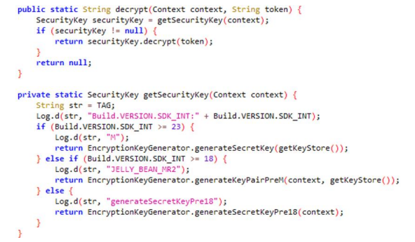 Decrypt 시 KeyStore에서 키를 가져온 후 안드로이드 SDK 버전에 따라 암복호화 키를 가져온다.