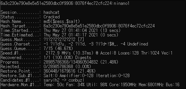 구해진 Salt 값과 MD5 해쉬를 사용해 hashcat 을 사용해 원본 문자열을 알아낸다.